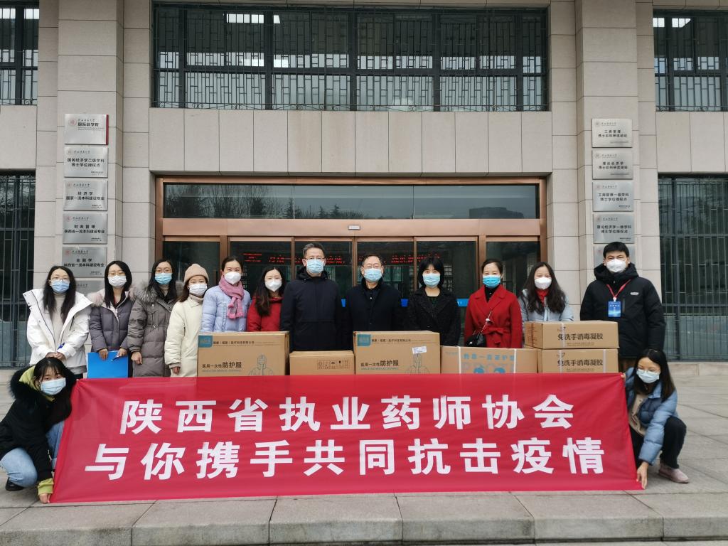 1月25日上午,陕西省职业药师协会协会会长李百华、副会长薛梅苓、副秘书长陈华等一行三人代表协会向永利官网捐赠了医用防护服、口罩、洗手凝胶、消毒液等大批防疫物资。学校国有资产管理处副处长吴迪、校友总会办公室(教育基金会秘书处)工作人员,学院党委书记思培峰、行政副院长杨静及相关人员参加了在学院楼前举行的捐赠仪式。