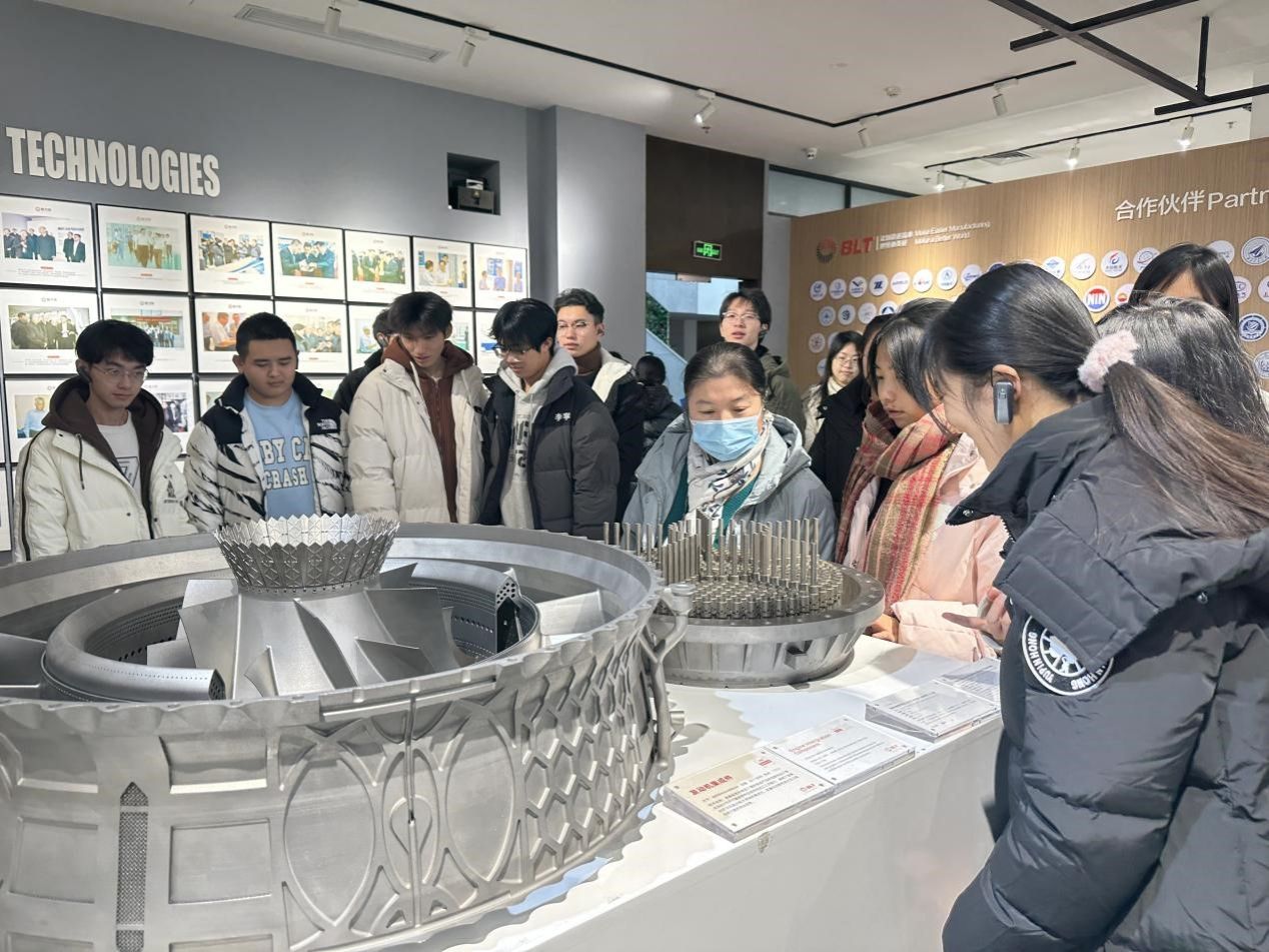 在铂力特人力资源部王霙的带领下,永利官网师生参观了公司的展示厅,了解了铂力特的发展历程、核心技术以及科研实力,实地观看了公司在航空航天、能源动力、医疗齿科、工业模具、汽车制造等多个领域应用的3D打印零件产品。王霙详细讲解了公司的一站式服务流程,包括设备、打印服务、原材料供应、技术服务以及企业的质量控制体系等,使学生们对增材制造行业、3D金属打印产品有了更直观、深入的了解。随后,永利官网师生参观了铂力特的数字化生产制造车间,近距离的观看了3D金属打印的生产制造过程。