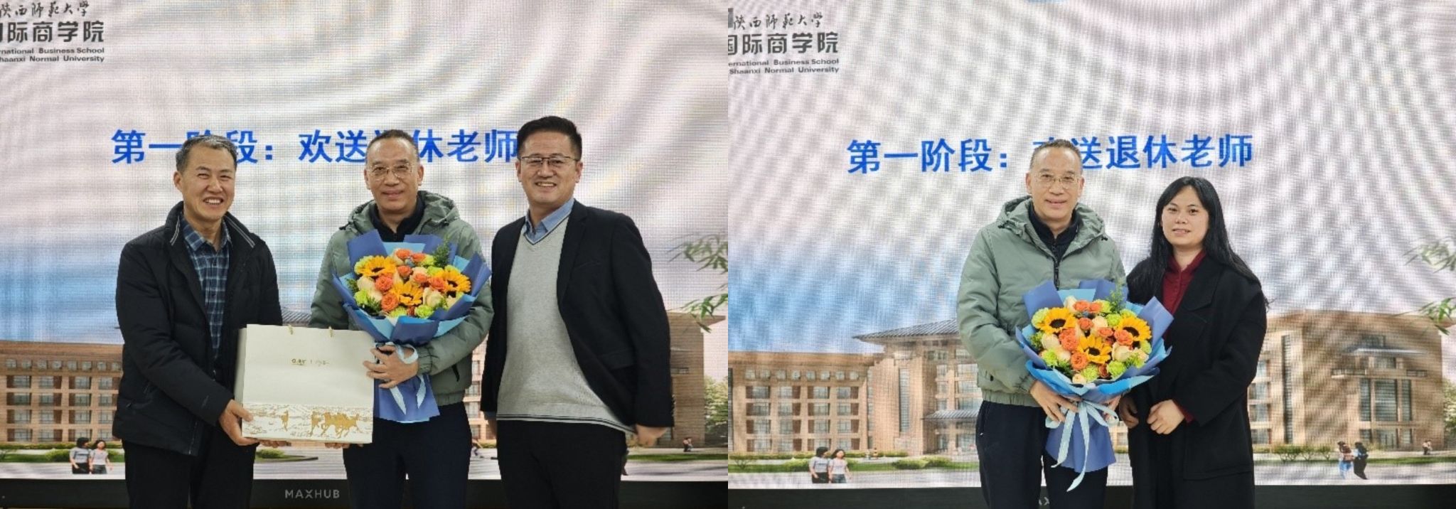 会议第二阶段为欢送退休教师,由行政副院长杨静主持。退休教师周晓唯作了荣休发言,教师代表朱雅玲为退休教师献上鲜花,思培峰书记、雷宏振院长为退休老师赠送纪念品,表达祝福。