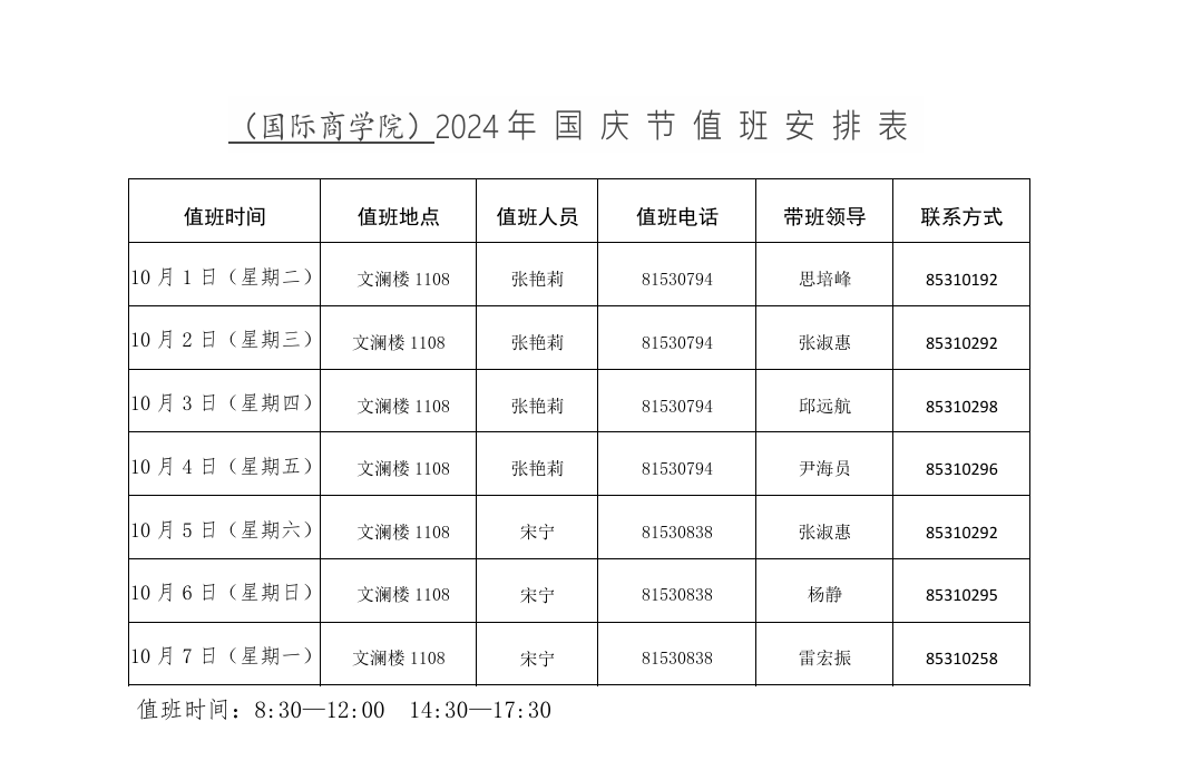 永利集团3044官网欢迎您2024年国庆节值班安排表