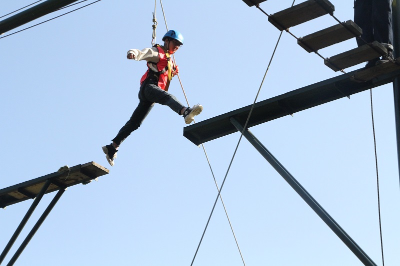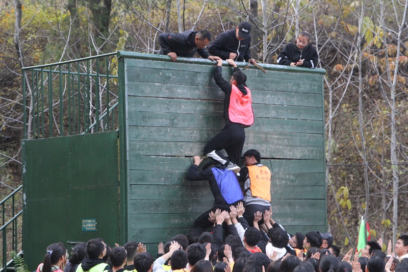 随后,教练带领所有队员徒步上山,前往秦岭高山营地完成了“飞越断桥”“挑战独木桥”等高空挑战项目和“人民公社大锅饭”“鼓动人心”等地面活动。最后一个项目 “毕业墙”给学生留下了最为深刻的印象,4.2米高的墙体要求194名队员在一个小时内全部通过,面对难关,大家齐心协力,用身体搭建人梯。最终,全体成员只用了26分59秒顺利“过墙”,顺利完成素质拓展的全部项目。